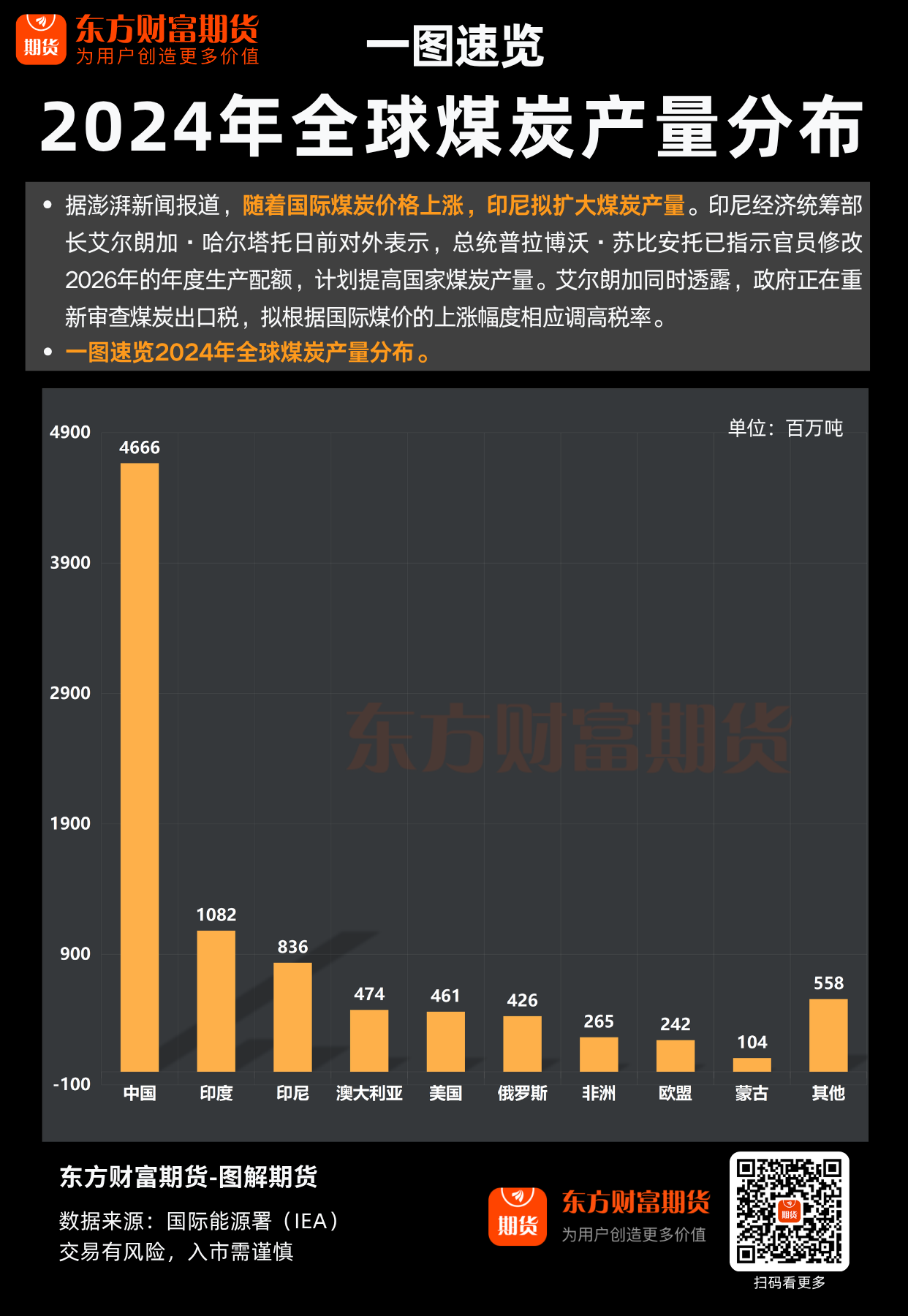 据澎湃新闻报道,随着国际煤炭价格上涨,印尼拟扩大煤炭产量。一图速览2024年全球煤炭产量分布。
