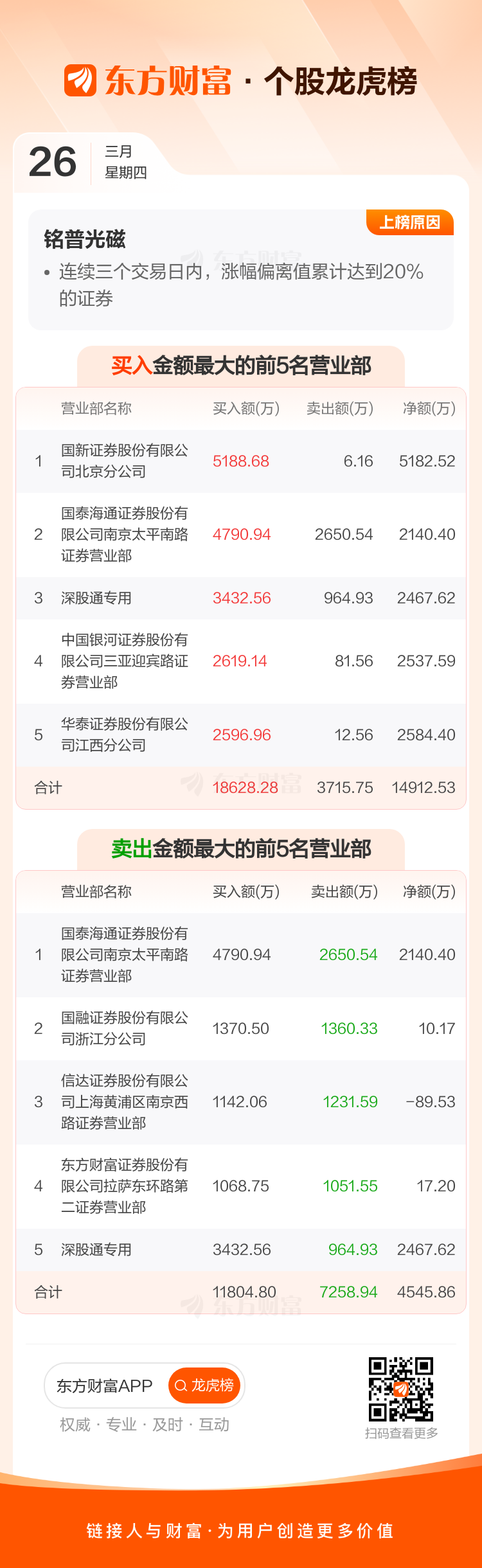 铭普光磁(002902)龙虎榜数据(03-26)