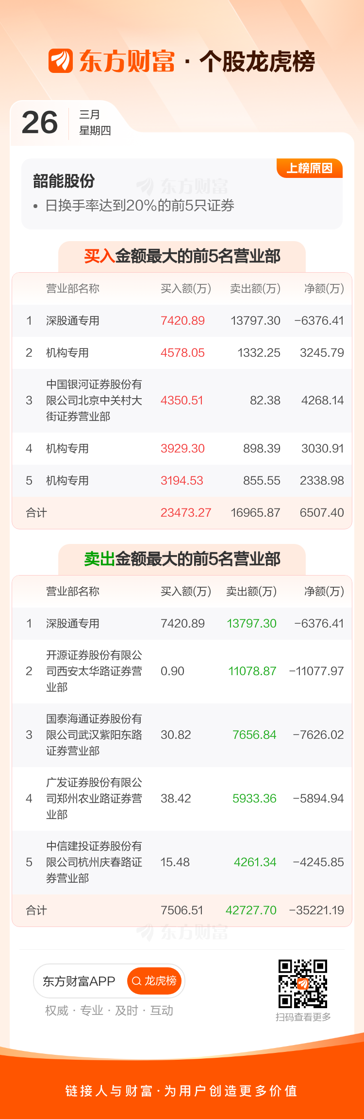 交易所2026年3月26日公布的交易公开信息显示,韶能股份因成为日换手率达到20%的前5只证券上榜。韶能股份当日收报8.07元,涨跌幅-9.02%,偏离值33.23%,换手率33.23%,成交额29.33亿。