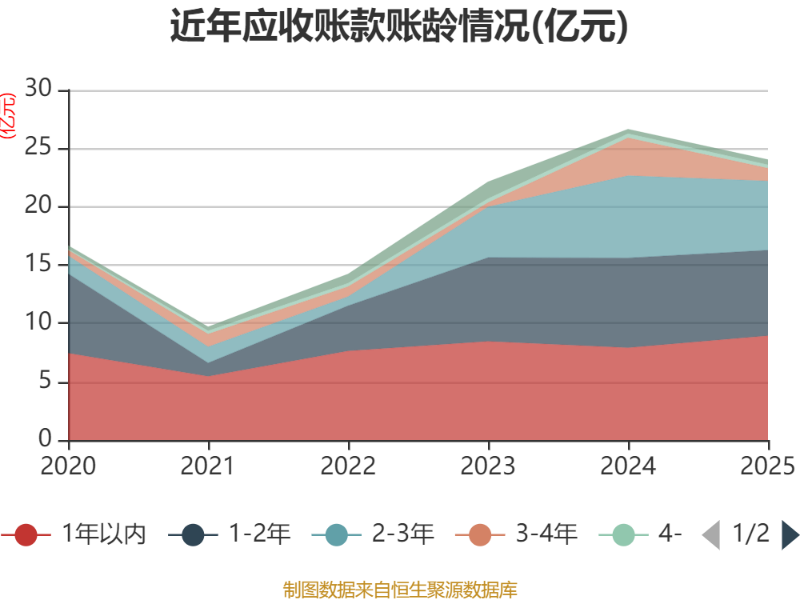 从应收账款账龄结构来看,截至2025年末,公司账龄在1年以内的应收账款余额为8.94亿元,较上年末增长1.03亿元,占应收账款总额比例为37.19%,较上年末上升7.52个百分点。