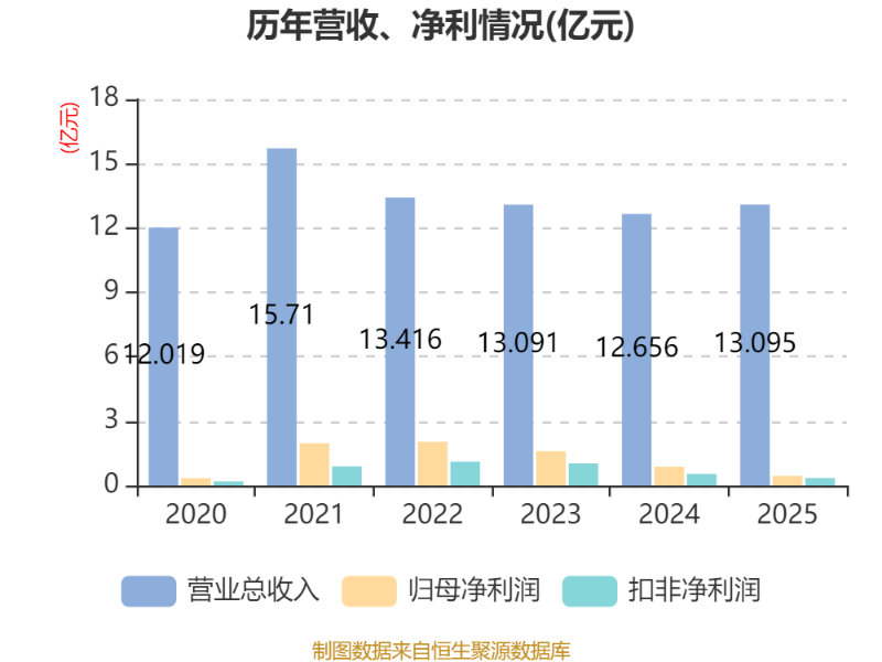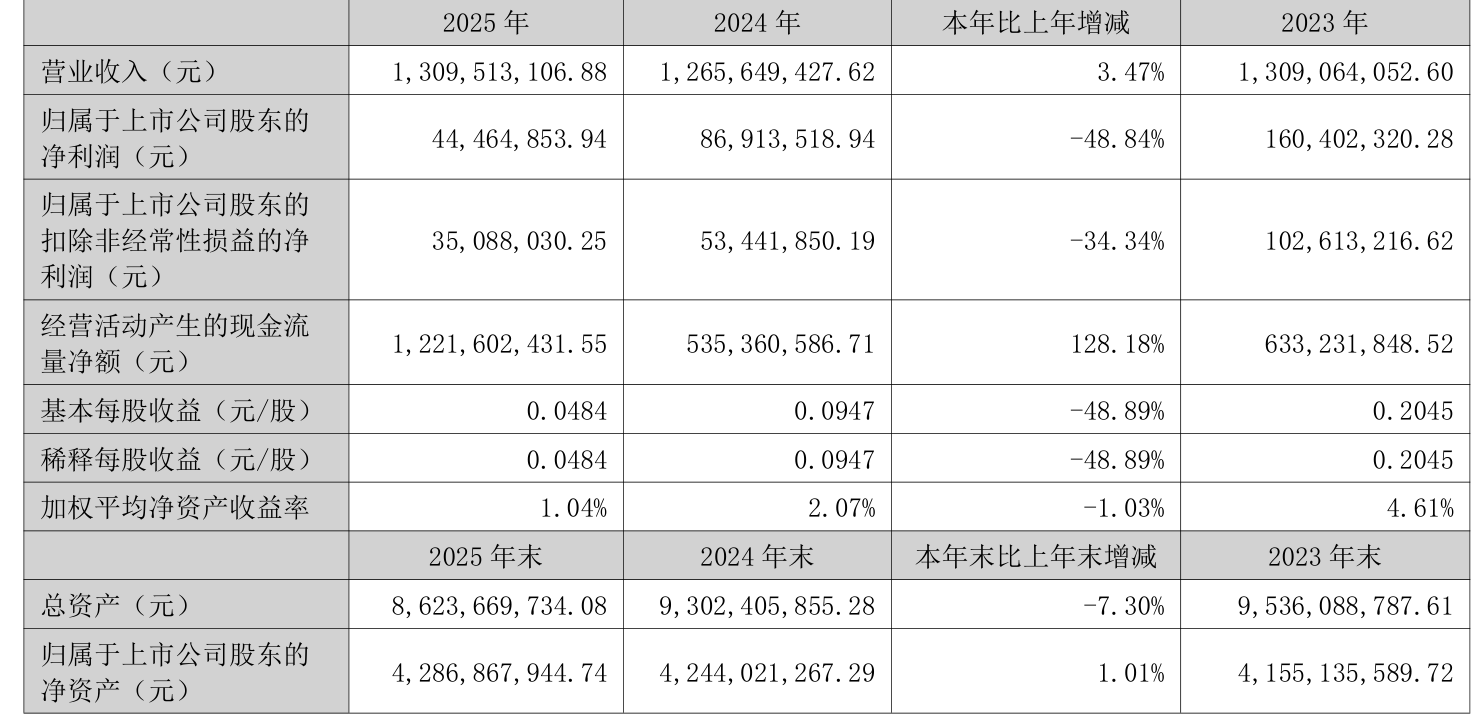 中证智能财讯银星能源(000862)3月26日披露2025年年度报告。2025年,公司实现营业总收入13.1亿元,同比增长3.47%;归母净利润4446.49万元,同比下降48.84%;扣非净利润3508.8万元,同比下降34.34%;经营活动产生的现金流量净额为12.22亿元,同比增长128.18%;报告期内,银星能源基本每股收益为0.0484元,加权平均净资产收益率为1.04%。