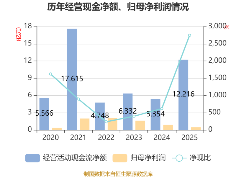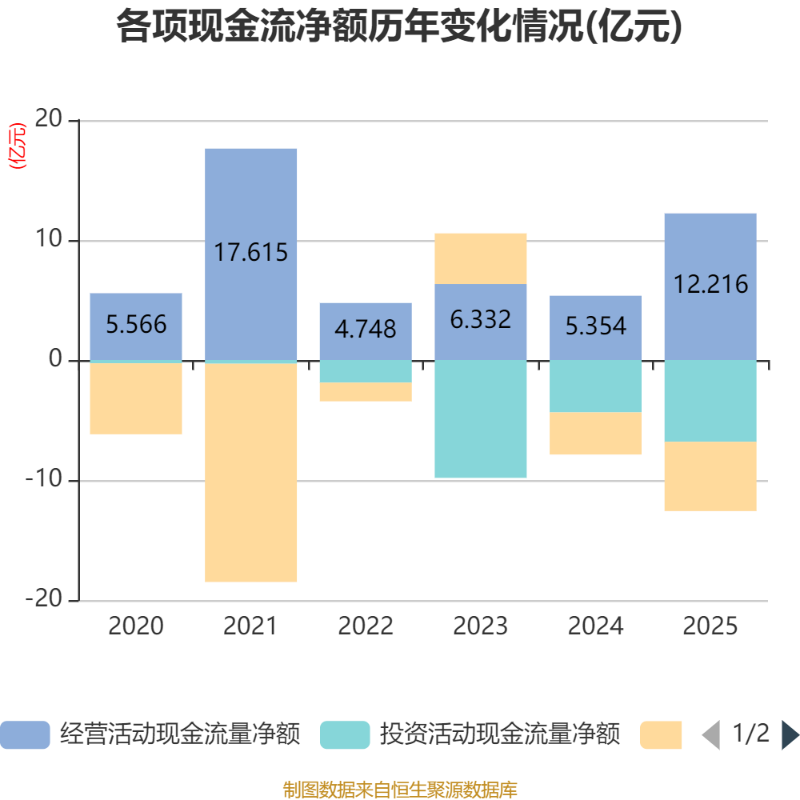 截至2025年,公司经营活动现金流净额为12.22亿元,同比增长128.18%;筹资活动现金流净额-5.78亿元,同比减少2.27亿元;投资活动现金流净额-6.81亿元,上年同期为-4.37亿元。