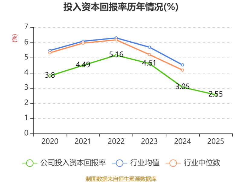 数据显示,2025年公司加权平均净资产收益率为1.04%,较上年同期下降1.03个百分点。公司2025年投入资本回报率为2.55%,较上年同期下降0.5个百分点。