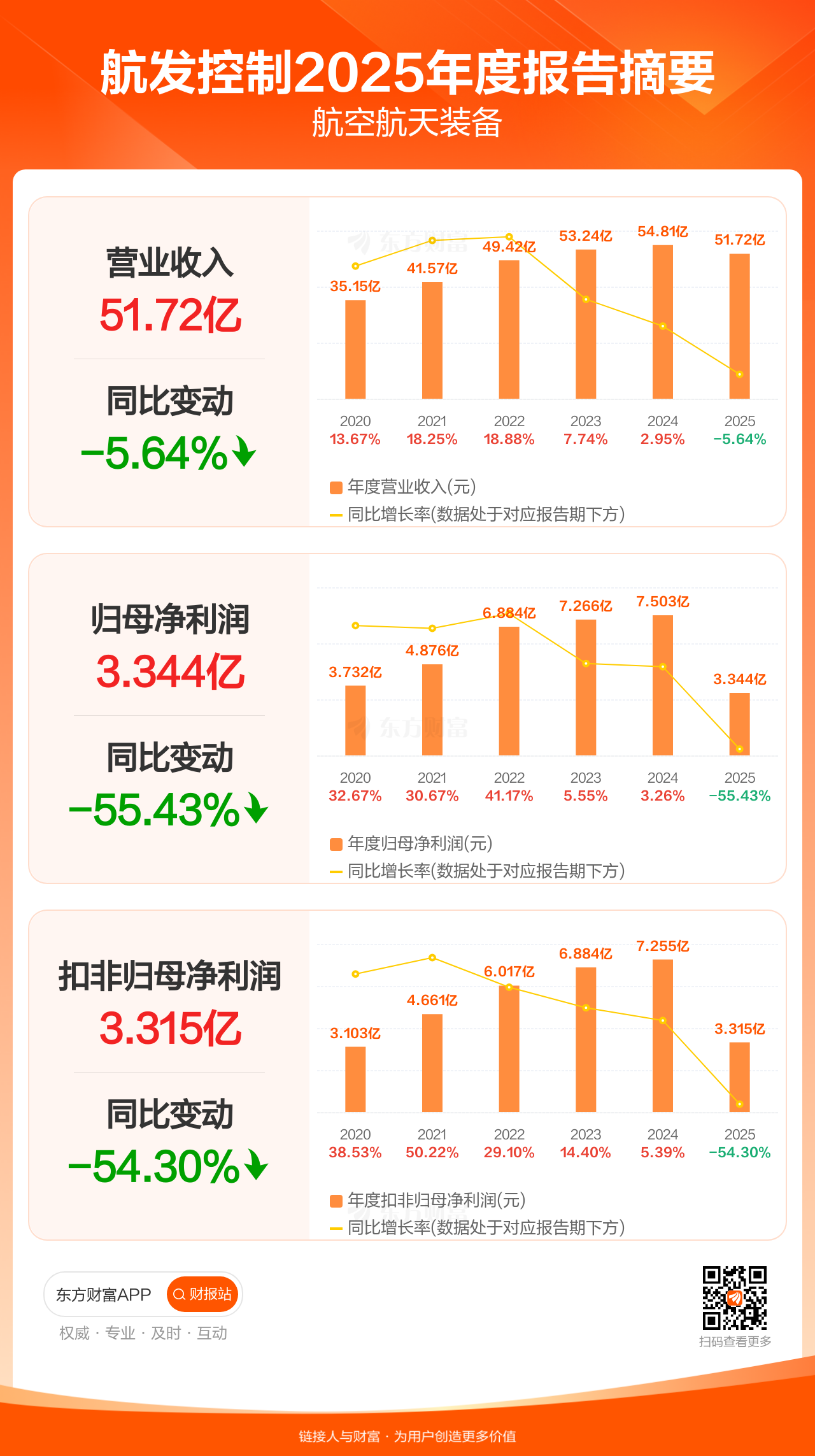 航发控制3月27日发布2025年年报显示,公司全年实现营业收入51.72亿元,同比下滑5.64%;归母净利润3.34亿元,同比下滑55.43%;扣非归母净利润3.32亿元,同比下滑54.30%。