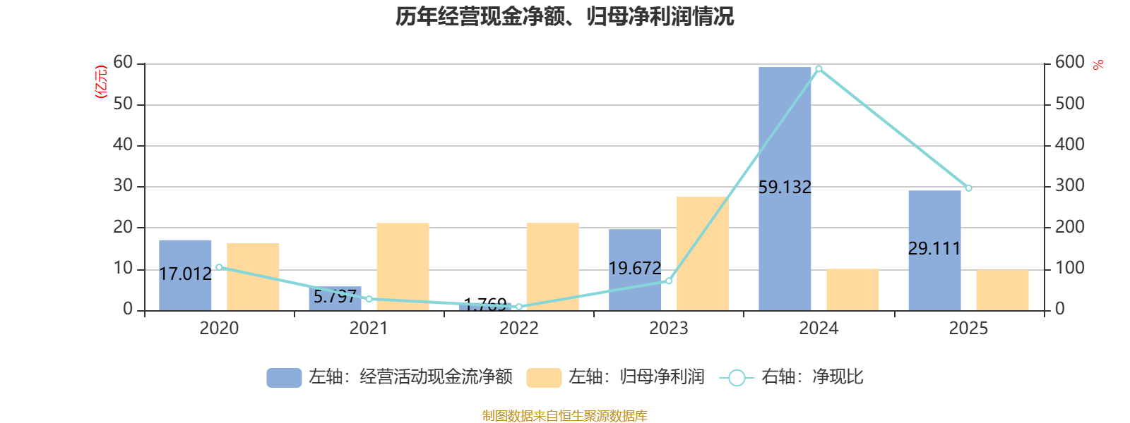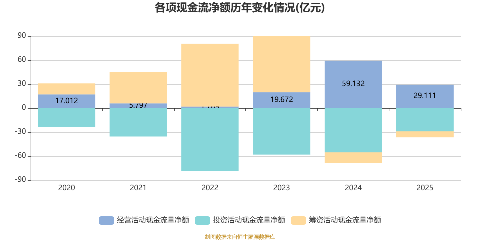 2025年,公司经营活动现金流净额为29.11亿元,同比下降50.77%;筹资活动现金流净额-7.49亿元,同比增加5.96亿元;投资活动现金流净额-29.24亿元,上年同期为-55.51亿元。