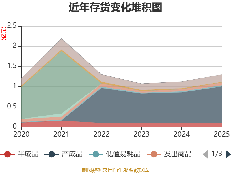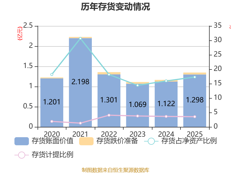 从存货变动来看,截至2025年末,公司存货账面价值为1.3亿元,占净资产的17.27%,较上年末增加1759.34万元。其中,存货跌价准备为475.24万元,计提比例为3.53%。