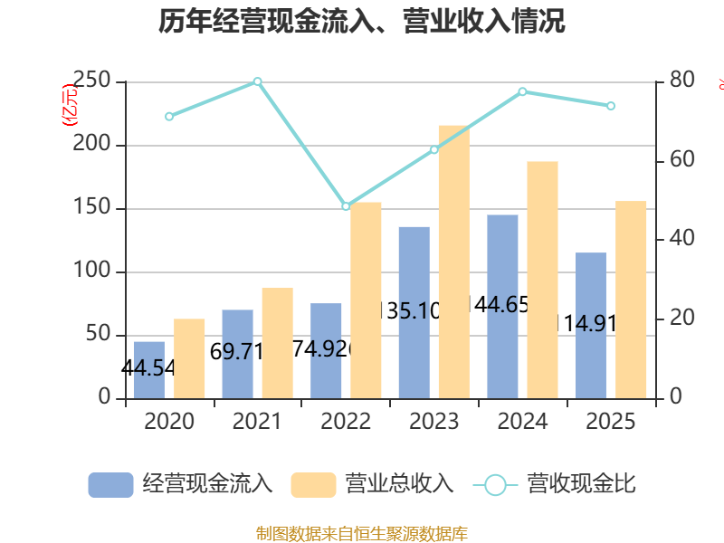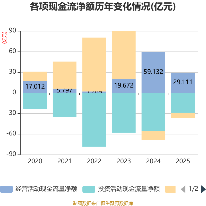 截至2025年,公司经营活动现金流净额为29.11亿元,同比下降50.77%;筹资活动现金流净额-7.49亿元,同比增加5.96亿元;投资活动现金流净额-29.24亿元,上年同期为-55.51亿元。