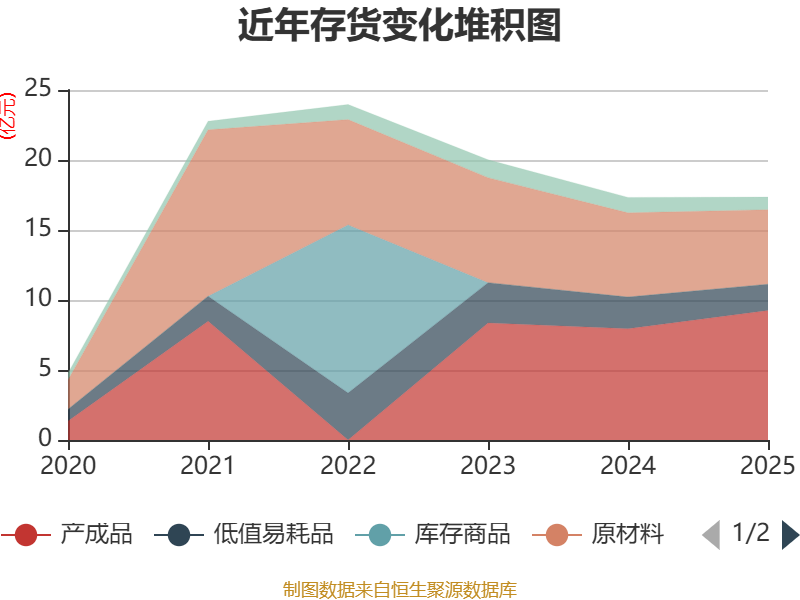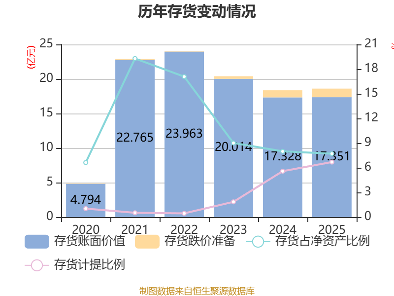 从存货变动来看,截至2025年末,公司存货账面价值为17.35亿元,占净资产的7.71%,较上年末增加230.37万元。其中,存货跌价准备为1.24亿元,计提比例为6.69%。