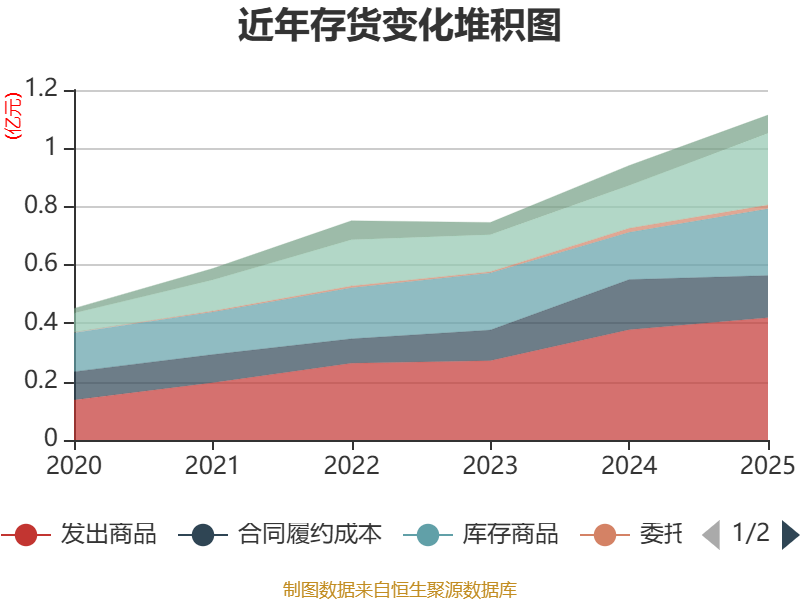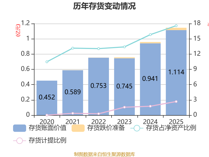 从存货变动来看,截至2025年末,公司存货账面价值为1.11亿元,占净资产的17.58%,较上年末增加1728.77万元。其中,存货跌价准备为305.29万元,计提比例为2.67%。