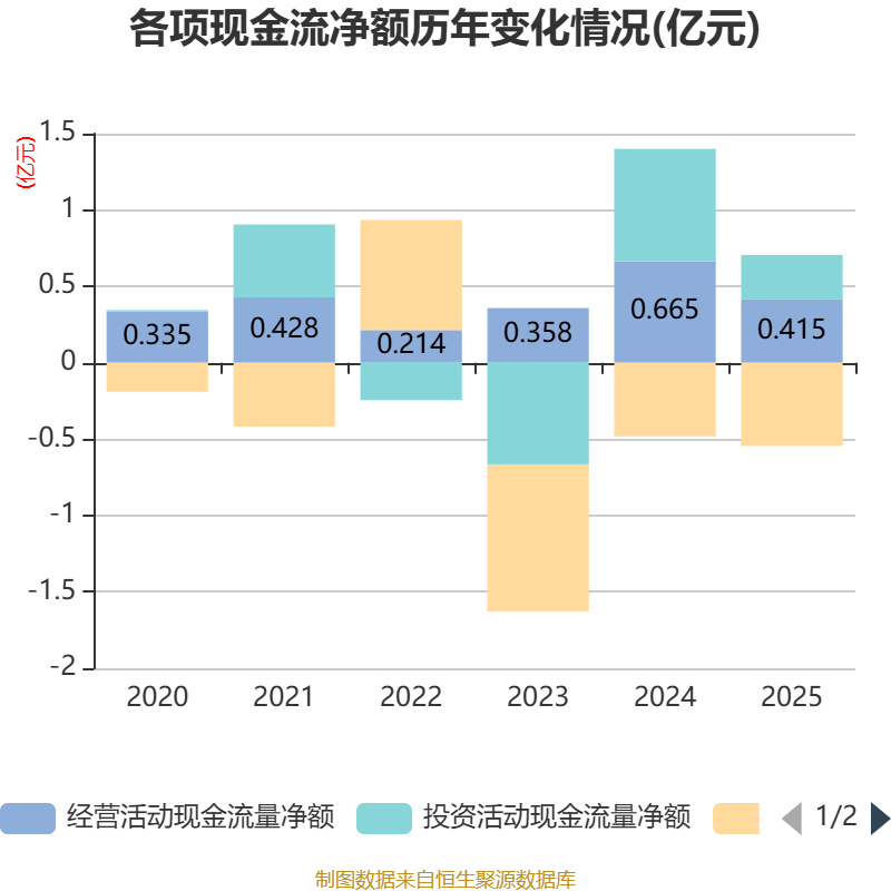 截至2025年,公司经营活动现金流净额为4150.87万元,同比下降37.54%;筹资活动现金流净额-5454.75万元,同比减少630.23万元;投资活动现金流净额2905.46万元,上年同期为7348.98万元。
