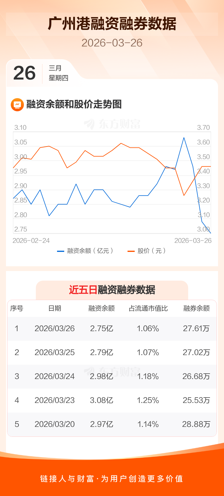 交易所最新数据显示,广州港于2026年3月26日获融资买入775.99万元,融资偿还1131.34万元,当日融资净偿还355.34万元。目前,该股融资余额2.75亿,占流通市值比例为1.06%。
