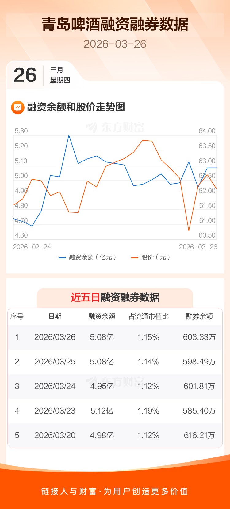 交易所最新数据显示,青岛啤酒于2026年3月26日获融资买入2134.05万元,融资偿还2148.46万元,当日融资净偿还14.41万元。目前,该股融资余额5.08亿,占流通市值比例为1.15%。