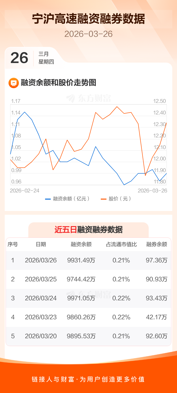 交易所最新数据显示,宁沪高速于2026年3月26日获融资买入896.48万元,融资偿还709.41万元,当日融资净买入187.07万元。目前,该股融资余额9931.49万,占流通市值比例为0.21%。