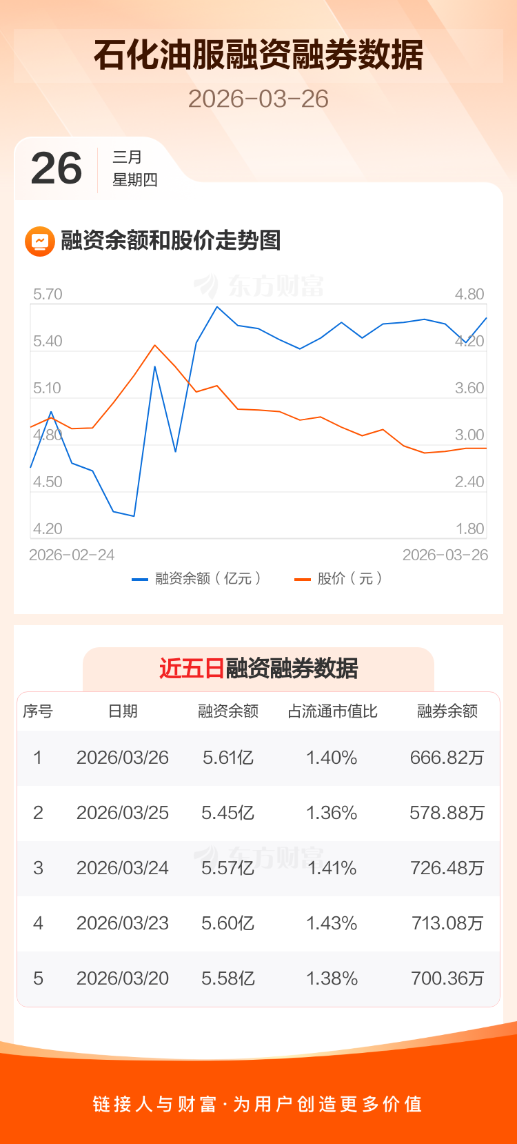 交易所最新数据显示,石化油服于2026年3月26日获融资买入6129.47万元,融资偿还4543.08万元,当日融资净买入1586.38万元。目前,该股融资余额5.61亿,占流通市值比例为1.40%。