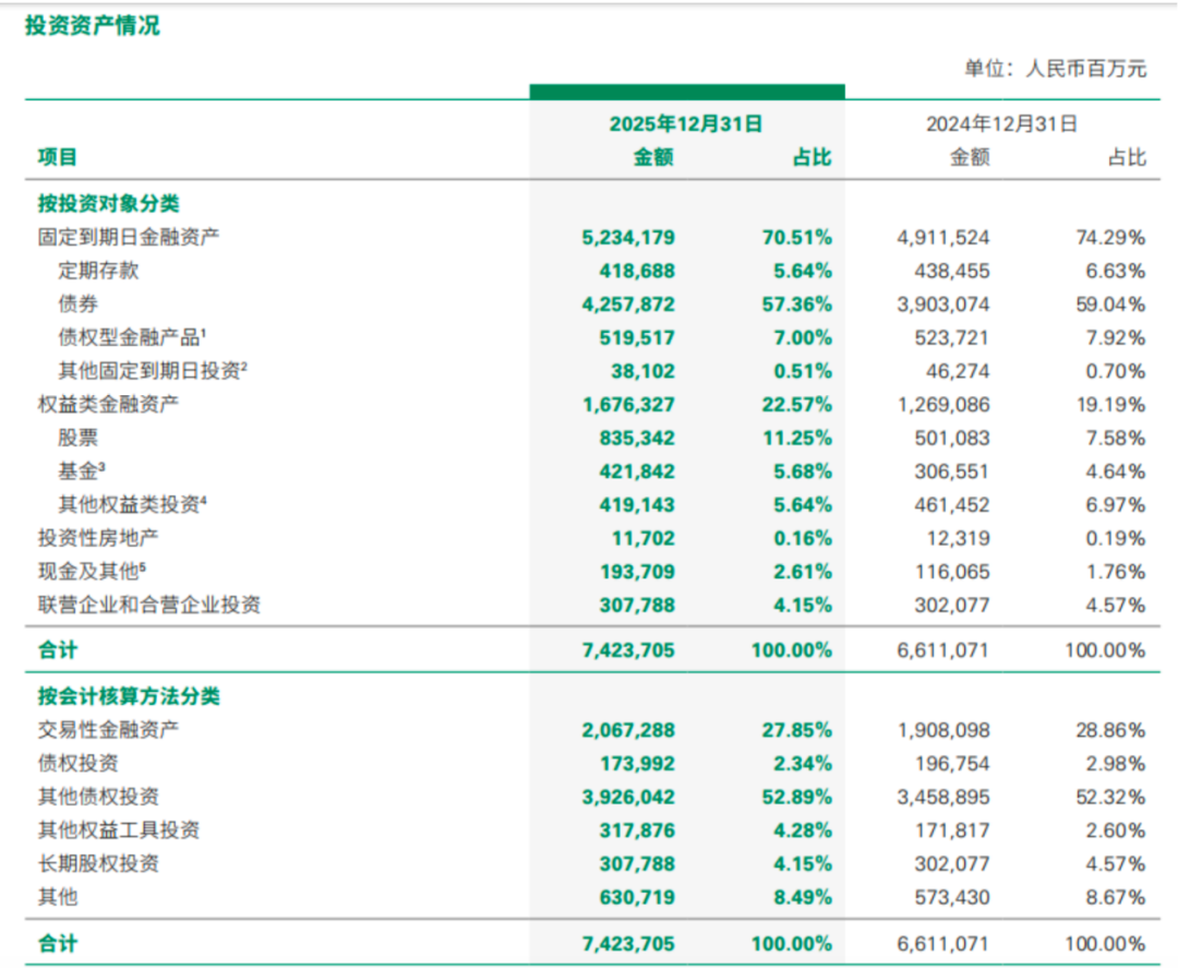 年报显示,截至2025年末,中国人寿股票和基金(不包含货币市场基金)配置比例由2024年末的12.18%上升至16.89%;公开市场权益投资规模超过1.2万亿元,较2025年初增加超4500亿元。