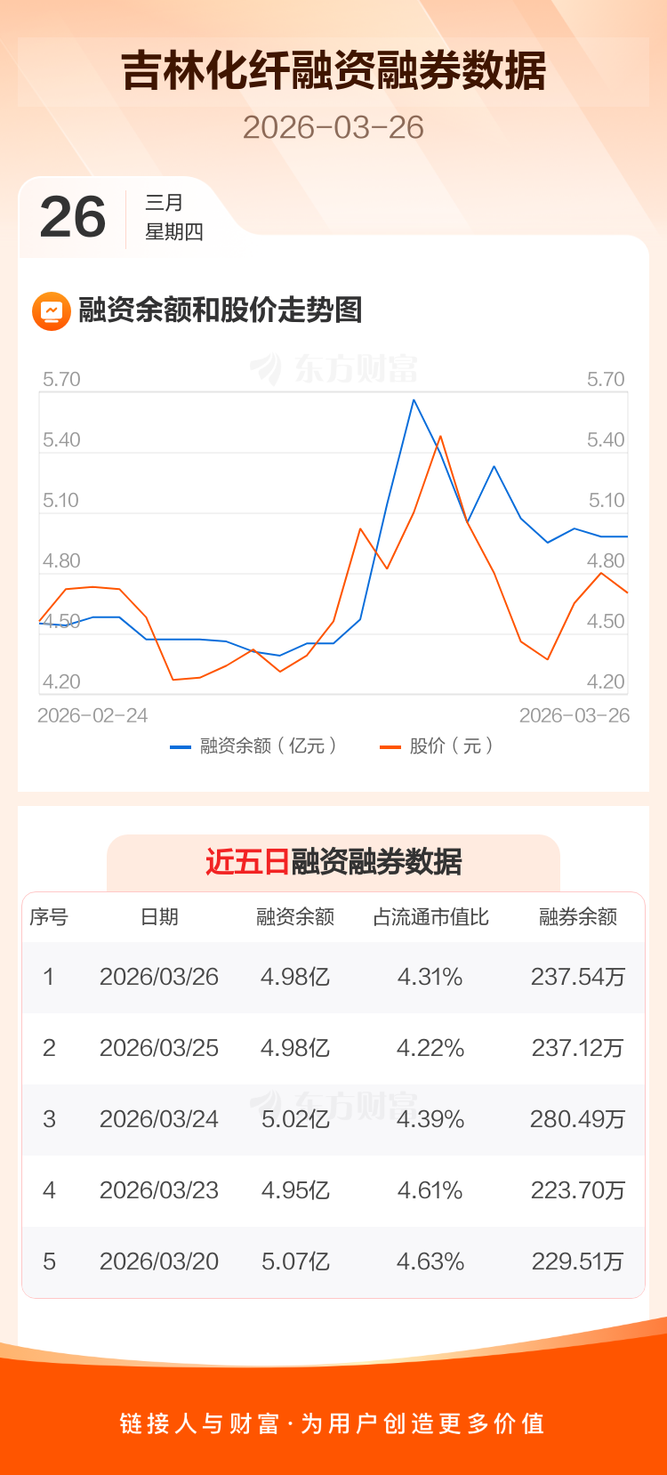 交易所最新数据显示,吉林化纤于2026年3月26日获融资买入7031.85万元,融资偿还6997.79万元,当日融资净买入34.07万元。目前,该股融资余额4.98亿,占流通市值比例为4.31%。