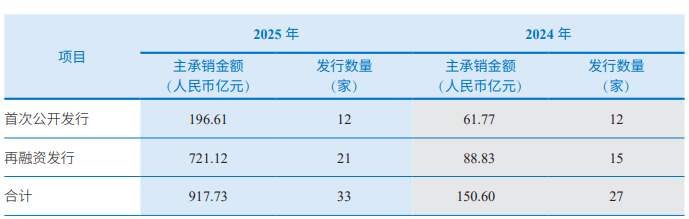 其中,股权融资境内业务上,中信建投完成A股股权融资项目33家,主承销金额917.73亿元。其中,IPO主承销家数12家,主承销金额196.61亿元;完成股权再融资项目21家,主承销金额721.12亿元。