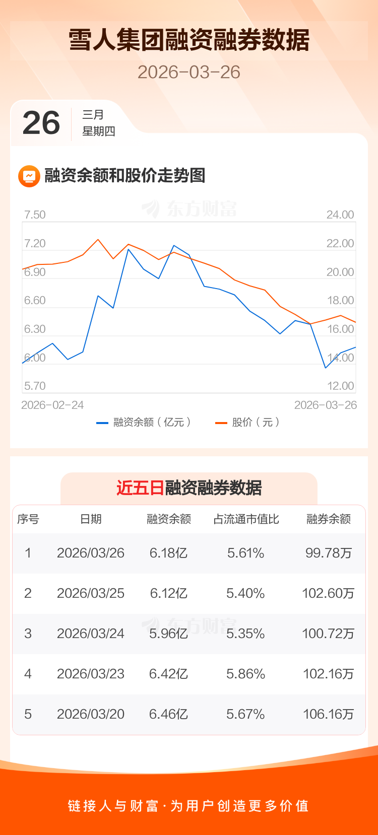 交易所最新数据显示,雪人集团于2026年3月26日获融资买入5365.16万元,融资偿还4797.83万元,当日融资净买入567.32万元。目前,该股融资余额6.18亿,占流通市值比例为5.61%。