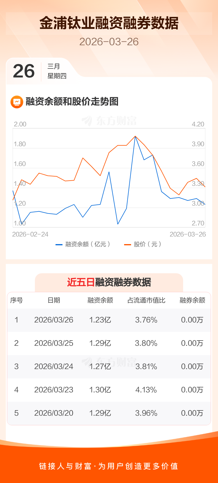 交易所最新数据显示,金浦钛业于2026年3月26日获融资买入1428.06万元,融资偿还2038.97万元,当日融资净偿还610.9万元。目前,该股融资余额1.23亿,占流通市值比例为3.76%。