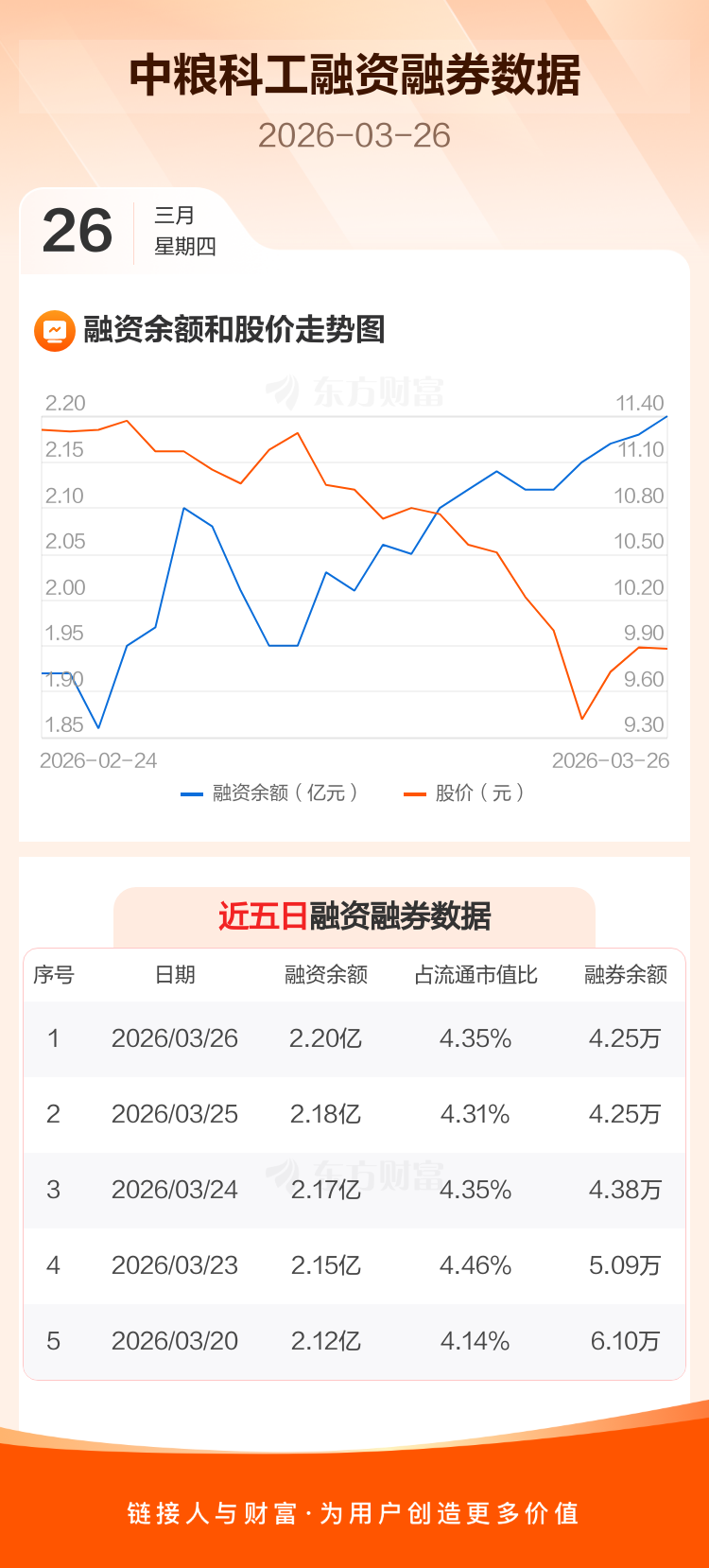 交易所最新数据显示,中粮科工于2026年3月26日获融资买入1001.95万元,融资偿还835.40万元,当日融资净买入166.55万元。目前,该股融资余额2.20亿,占流通市值比例为4.35%。