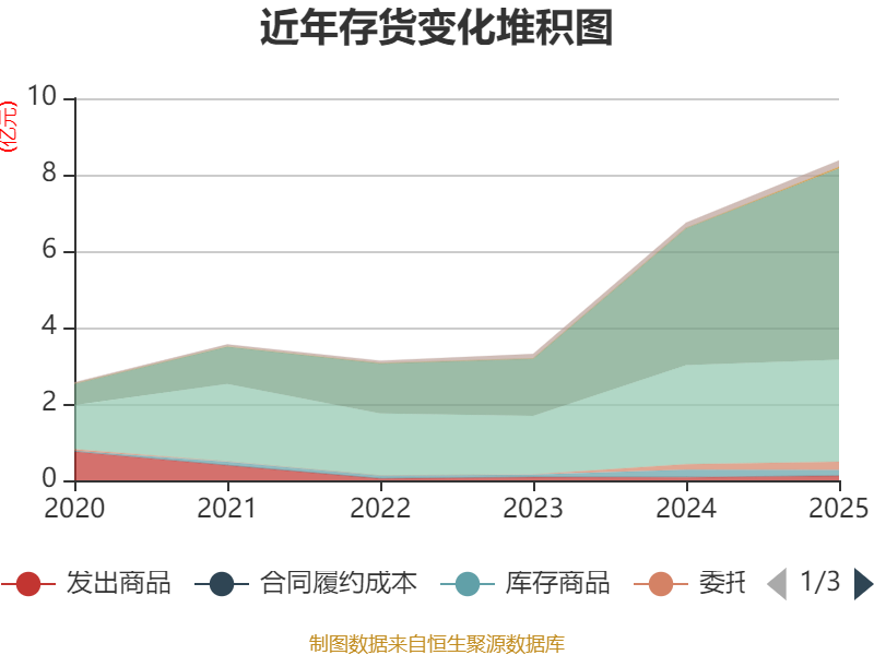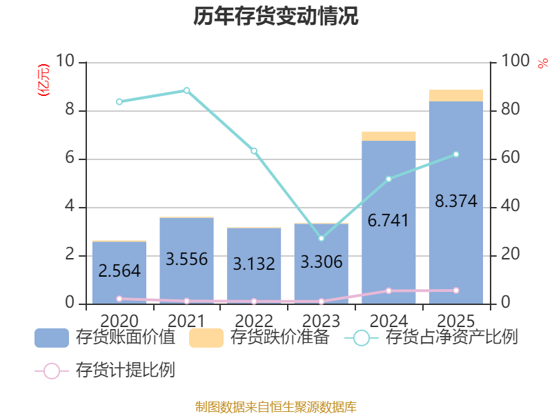 从存货变动来看,截至2025年末,公司存货账面价值为8.37亿元,占净资产的61.83%,较上年末增加1.63亿元。其中,存货跌价准备为4833.08万元,计提比例为5.46%。