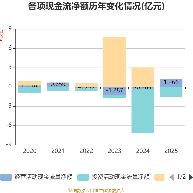 截至2025年,公司经营活动现金流净额为1.27亿元,同比增加1.55亿元;筹资活动现金流净额-682.05万元,同比减少3.09亿元;投资活动现金流净额-1.57亿元,上年同期为-6.94亿元。