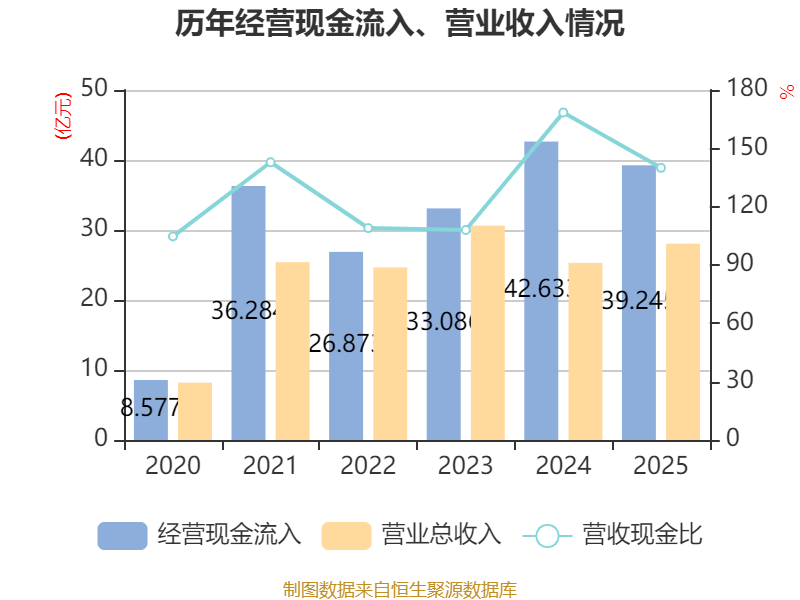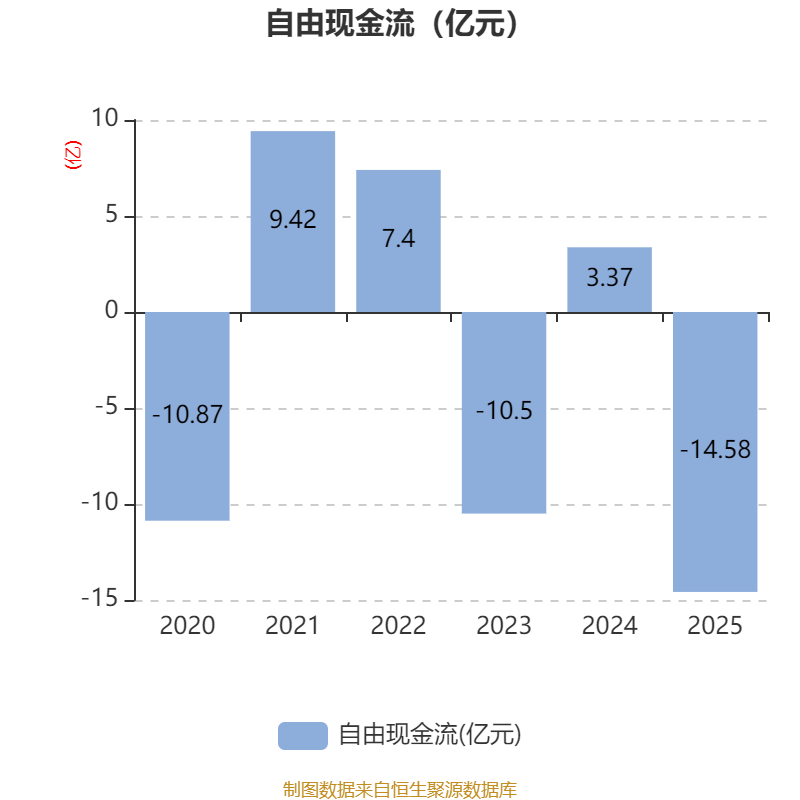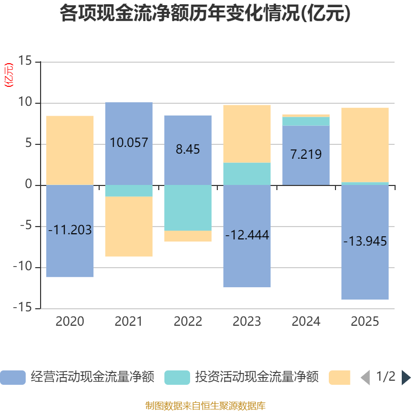 截至2025年,公司经营活动现金流净额为-13.95亿元,同比减少21.16亿元;筹资活动现金流净额9.04亿元,同比增加8.74亿元;投资活动现金流净额3503.11万元,上年同期为1.06亿元。