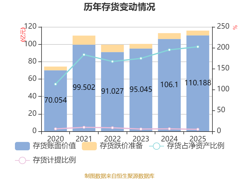 从存货变动来看,截至2025年末,公司存货账面价值为110.19亿元,占净资产的202.34%,较上年末增加4.09亿元。其中,存货跌价准备为5.48亿元,计提比例为4.73%。
