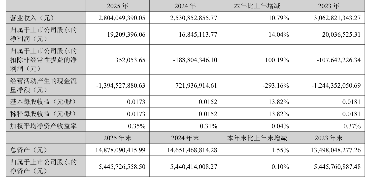 中证智能财讯天保基建(000965)3月27日披露2025年年度报告。2025年,公司实现营业总收入28.04亿元,同比增长10.79%;归母净利润1920.94万元,同比增长14.04%;扣非净利润35.21万元,同比扭亏;经营活动产生的现金流量净额为-13.95亿元,上年同期为7.22亿元;报告期内,天保基建基本每股收益为0.0173元,加权平均净资产收益率为0.35%。公司2025年度分配预案为:拟向全体股东每10股派现0.1元(含税)。