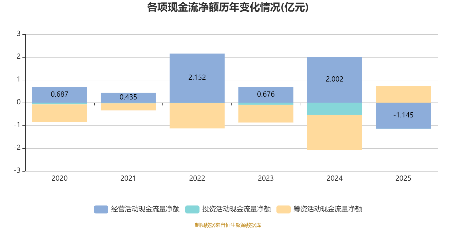 2025年,公司经营活动现金流净额为-1.14亿元,同比减少3.15亿元;筹资活动现金流净额7171.3万元,同比增加2.27亿元;投资活动现金流净额-88.38万元,上年同期为-5370.4万元。