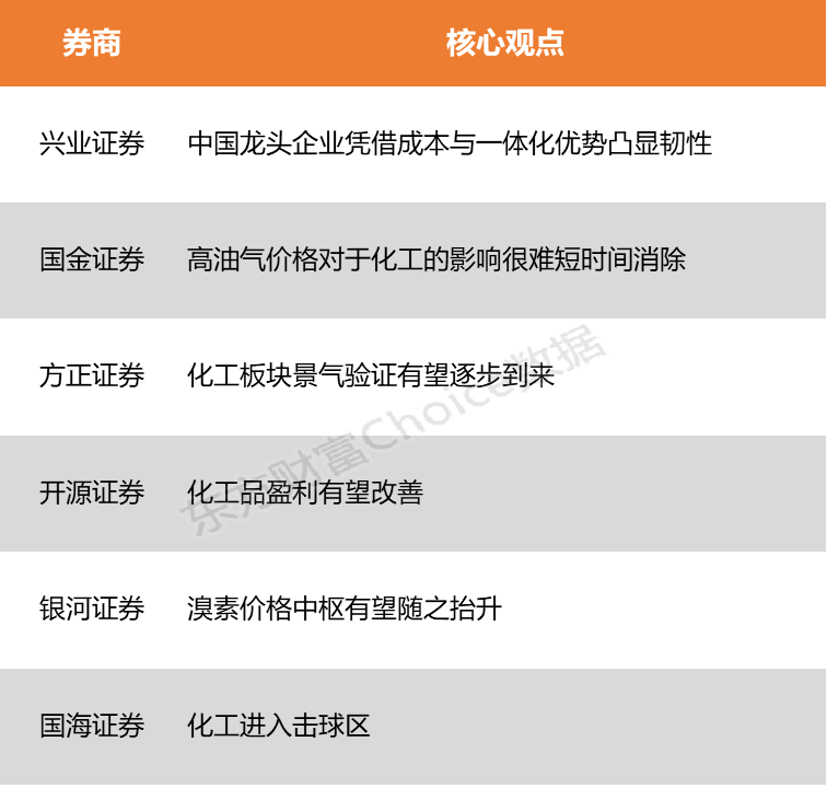 兴业证券认为,地缘冲突重塑全球化工供给格局,中国龙头企业凭借成本与一体化优势凸显韧性。国金证券指出,高油气价格持续超预期,联动影响开始逐步显现,油气价格维持高位预估将大概率持续,对于化工的影响很难短时间消除,预估持续影响时间将明显拉长。