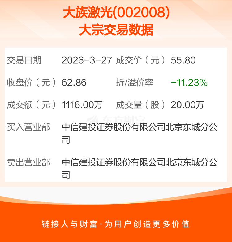 2026年3月27日,大族激光发生1笔大宗交易,共成交20.00万股,成交金额1116.00万元,占其流通市值比例为0.02%。