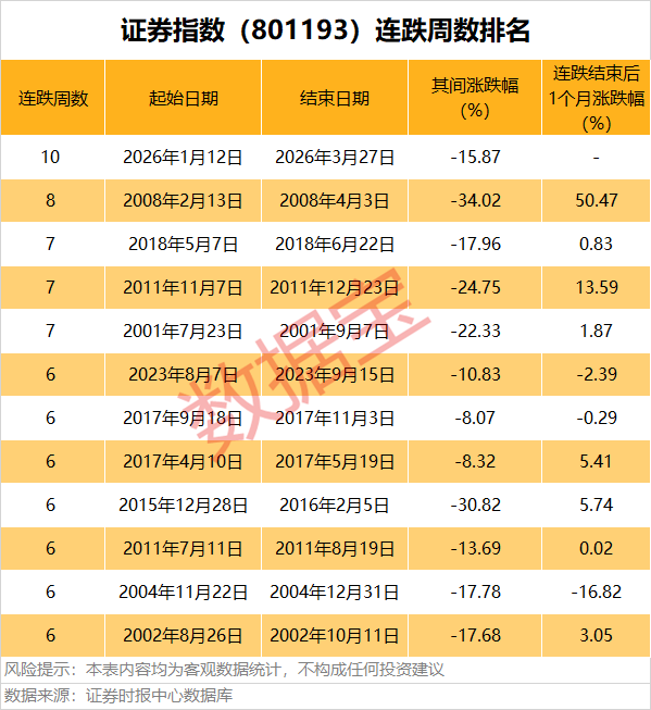 证券指数周线十连跌,已经大幅创出历史新纪录。此前,证券指数有1次周线八连跌,为2008年2月13日至2008年4月3日;另外,还有3次周线七连跌,分别发生在2018年、2011年和2001年。