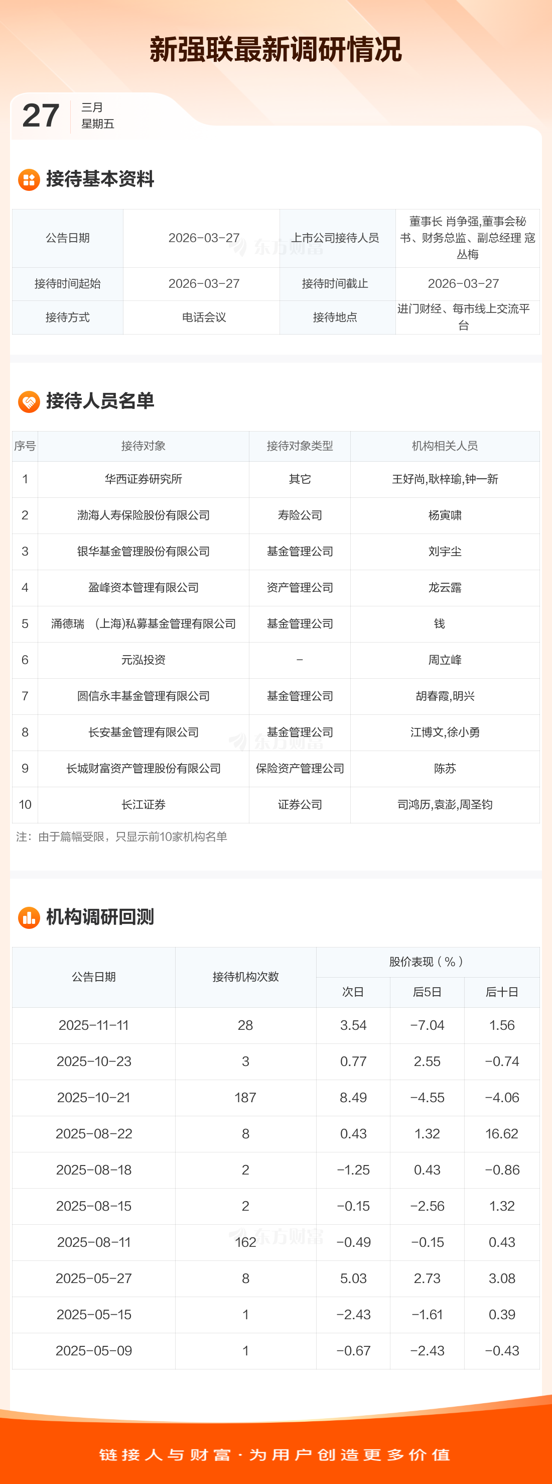 新强联3月27日公告称,3月27日接待华西证券研究所等123家机构调研。接待人员包括董事长 肖争强,董事会秘书、财务总监、副总经理 寇丛梅。