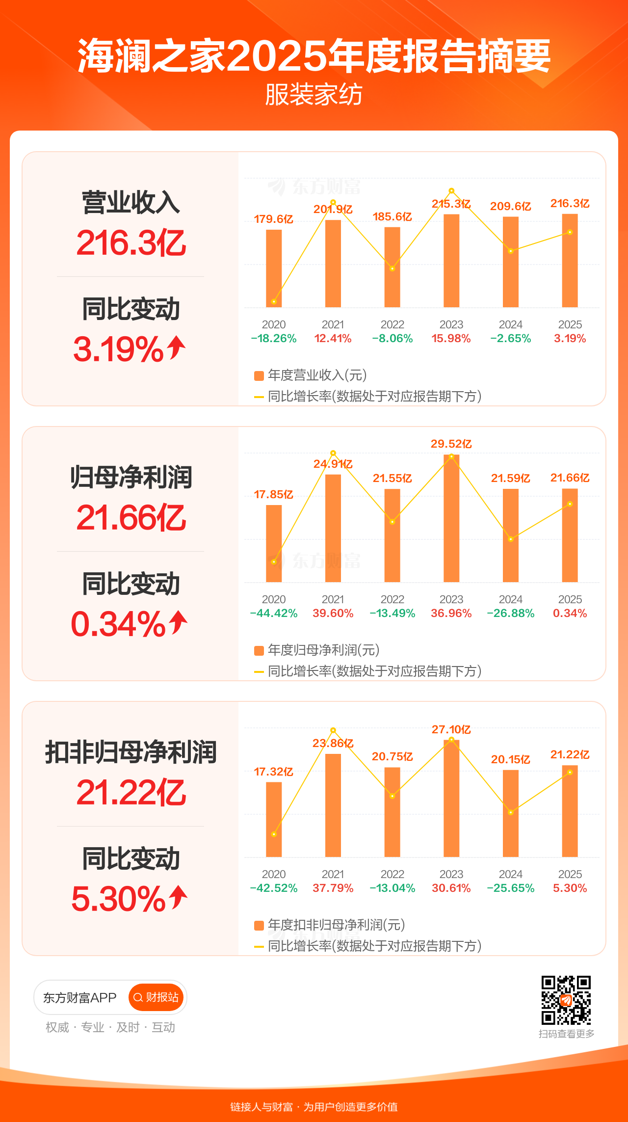 海澜之家3月28日发布2025年年报显示,公司全年实现营业收入216.26亿元,同比增长3.19%;归母净利润21.66亿元,同比增长0.34%;扣非归母净利润21.22亿元,同比增长5.30%。