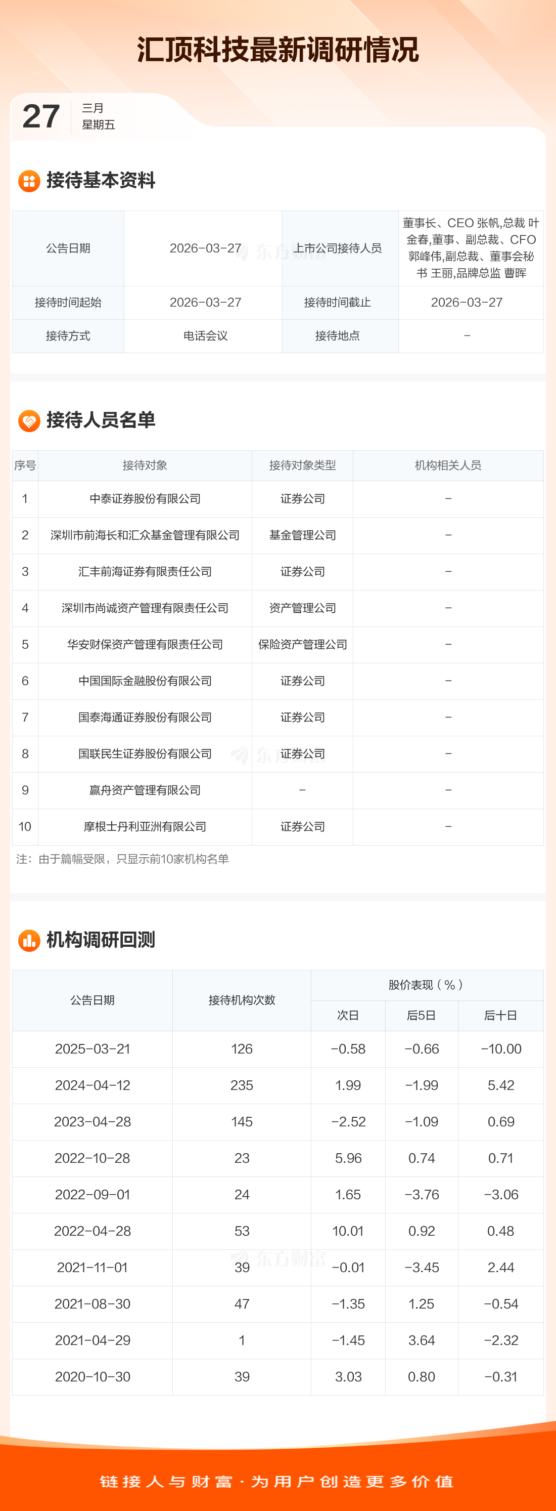汇顶科技3月27日公告称,3月27日接待中泰证券股份有限公司等54家机构调研。接待人员包括董事长、CEO 张帆,总裁 叶金春,董事、副总裁、CFO 郭峰伟,副总裁、董事会秘书 王丽,品牌总监 曹晖。