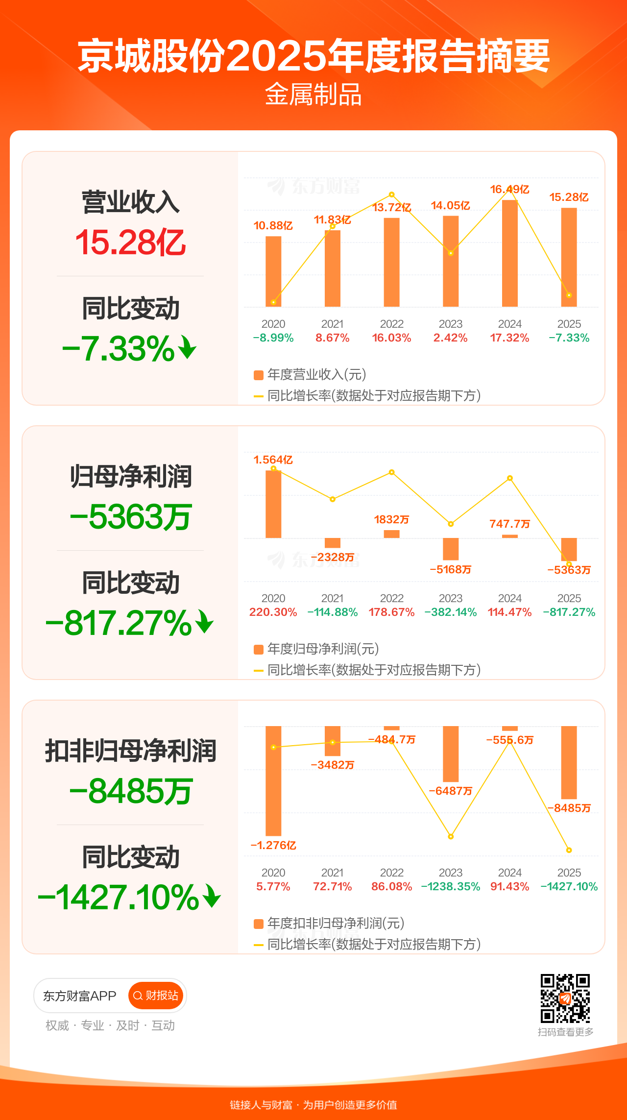京城股份3月28日发布2025年年报显示,公司全年实现营业收入15.28亿元,同比下滑7.33%;归母净利润-5363.09万元;扣非归母净利润-8485.33万元。