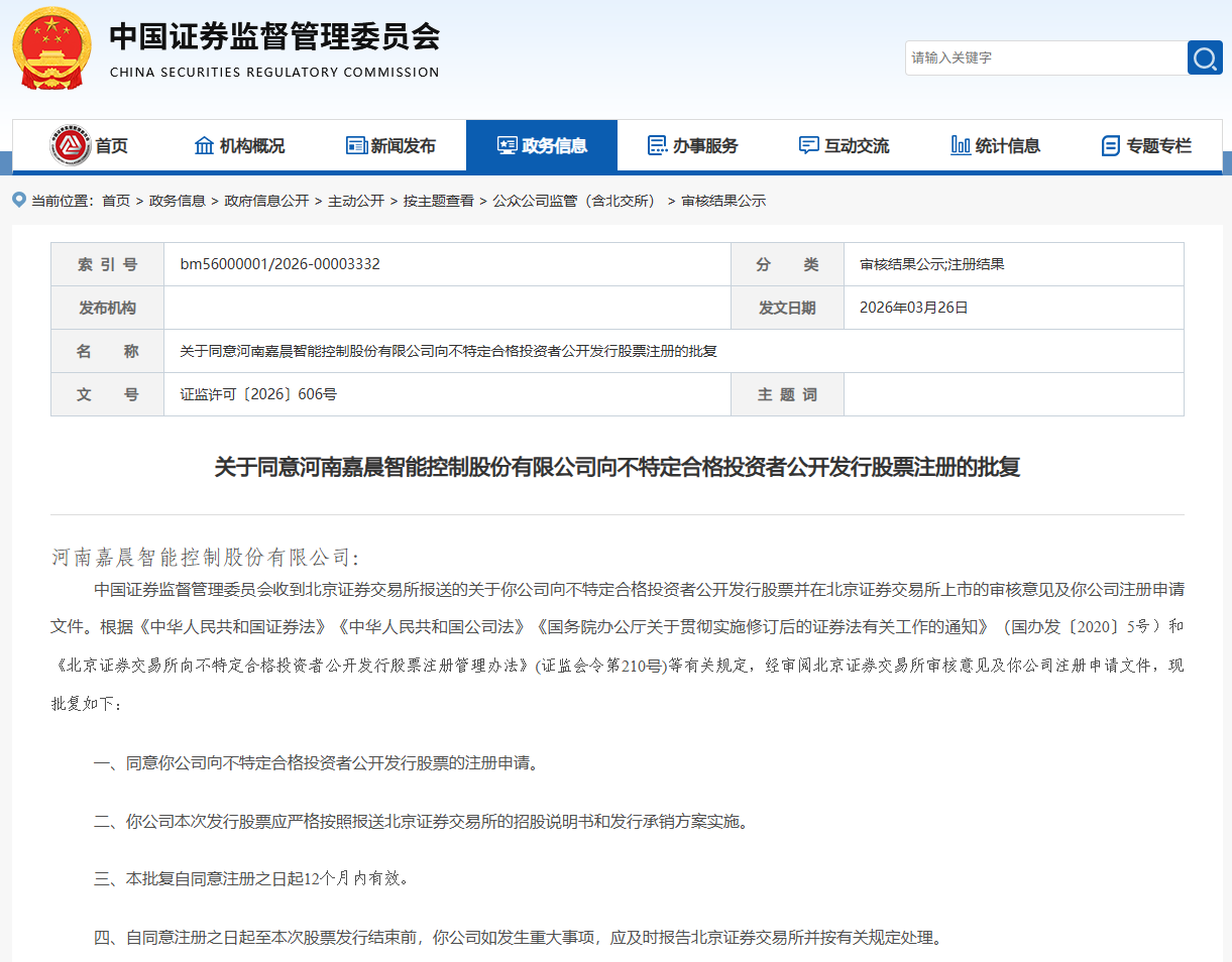 3月27日消息,证监会批复,同意河南嘉晨智能控制股份有限公司向不特定合格投资者公开发行股票的注册申请。