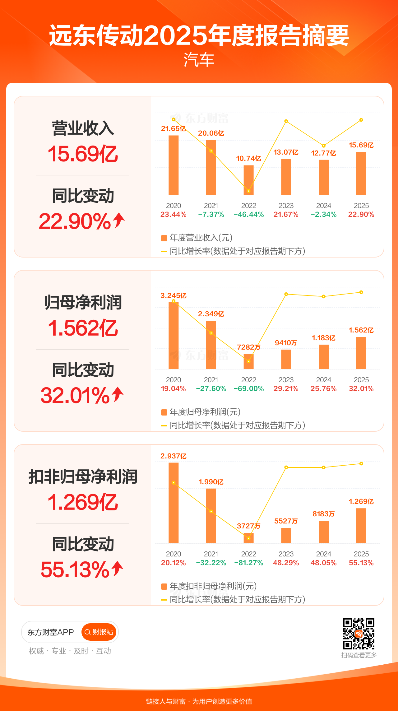 远东传动3月28日发布2025年年报显示,公司全年实现营业收入15.69亿元,同比增长22.90%;归母净利润1.56亿元,同比增长32.01%;扣非归母净利润1.27亿元,同比增长55.13%。