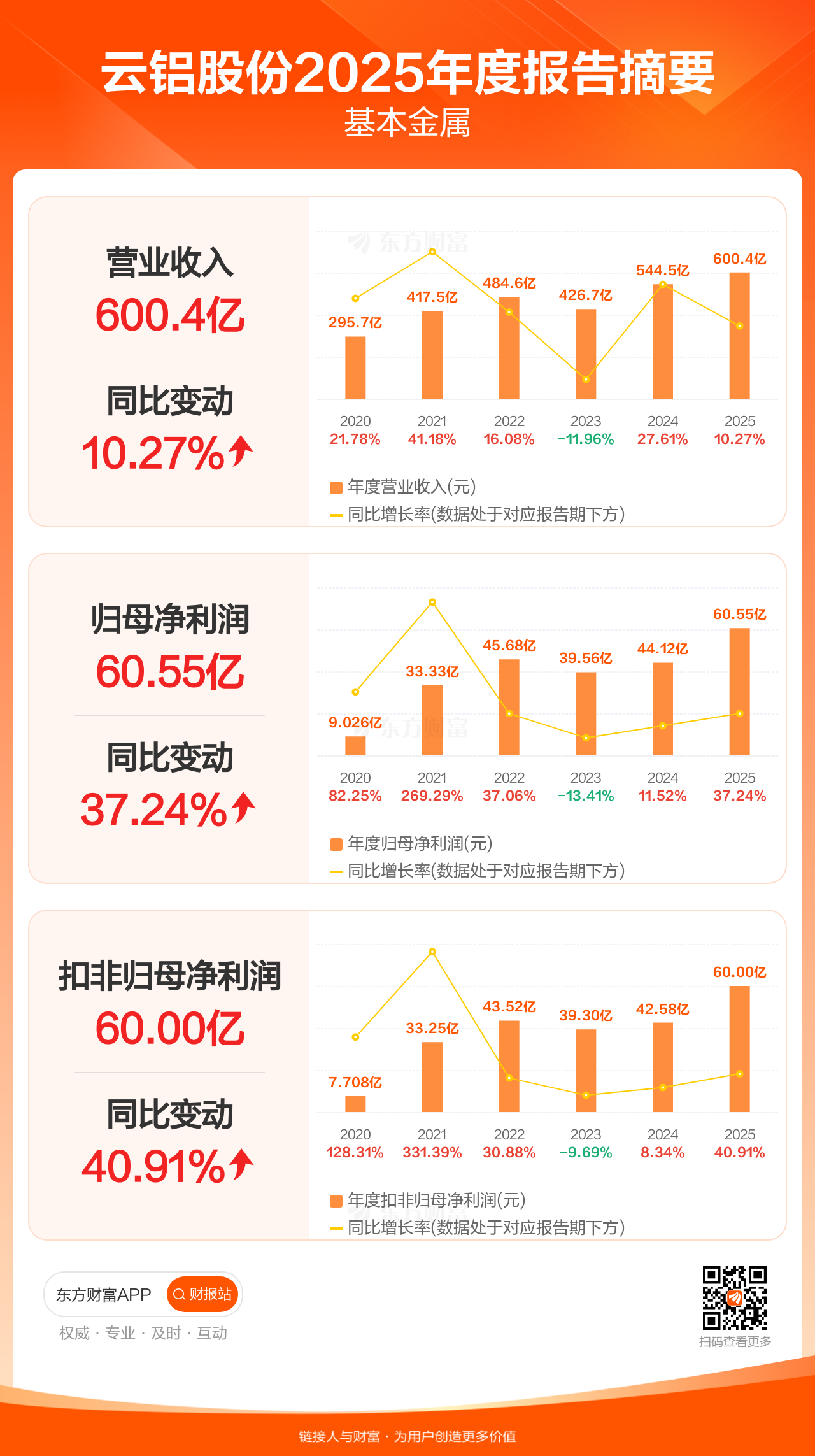 云铝股份3月28日发布2025年年报显示,公司全年实现营业收入600.43亿元,同比增长10.27%;归母净利润60.55亿元,同比增长37.24%;扣非归母净利润60.00亿元,同比增长40.91%。