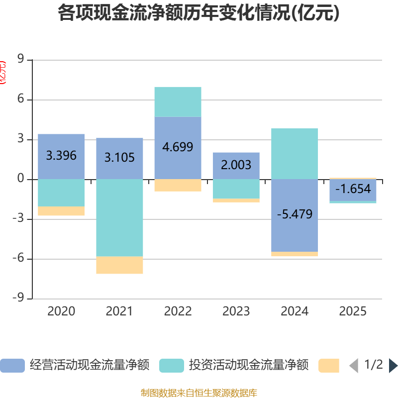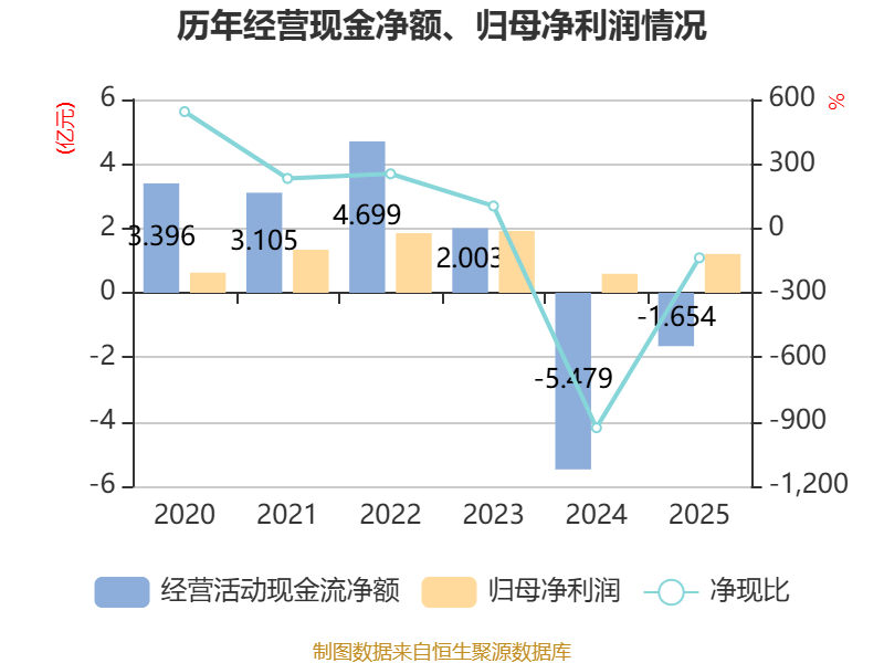 截至2025年,公司经营活动现金流净额为-1.65亿元,同比增加3.83亿元;筹资活动现金流净额971.42万元,同比增加4333.69万元;投资活动现金流净额-1643.59万元,上年同期为3.83亿元。