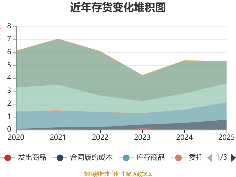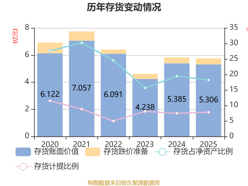 从存货变动来看,截至2025年末,公司存货账面价值为5.31亿元,占净资产的18.19%,较上年末减少786.07万元。其中,存货跌价准备为4482.42万元,计提比例为7.79%。