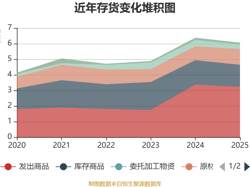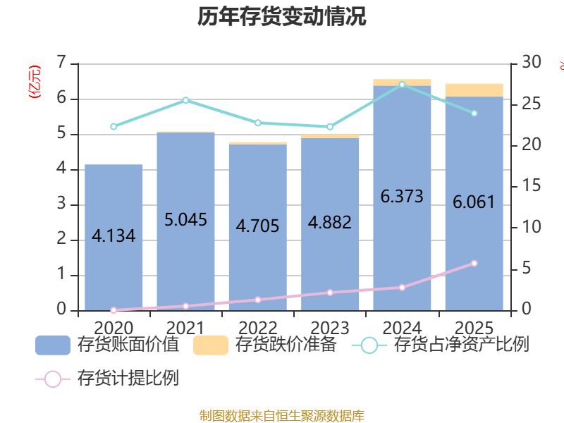 从存货变动来看,截至2025年末,公司存货账面价值为6.06亿元,占净资产的23.94%,较上年末减少3118.11万元。其中,存货跌价准备为3661.59万元,计提比例为5.7%。