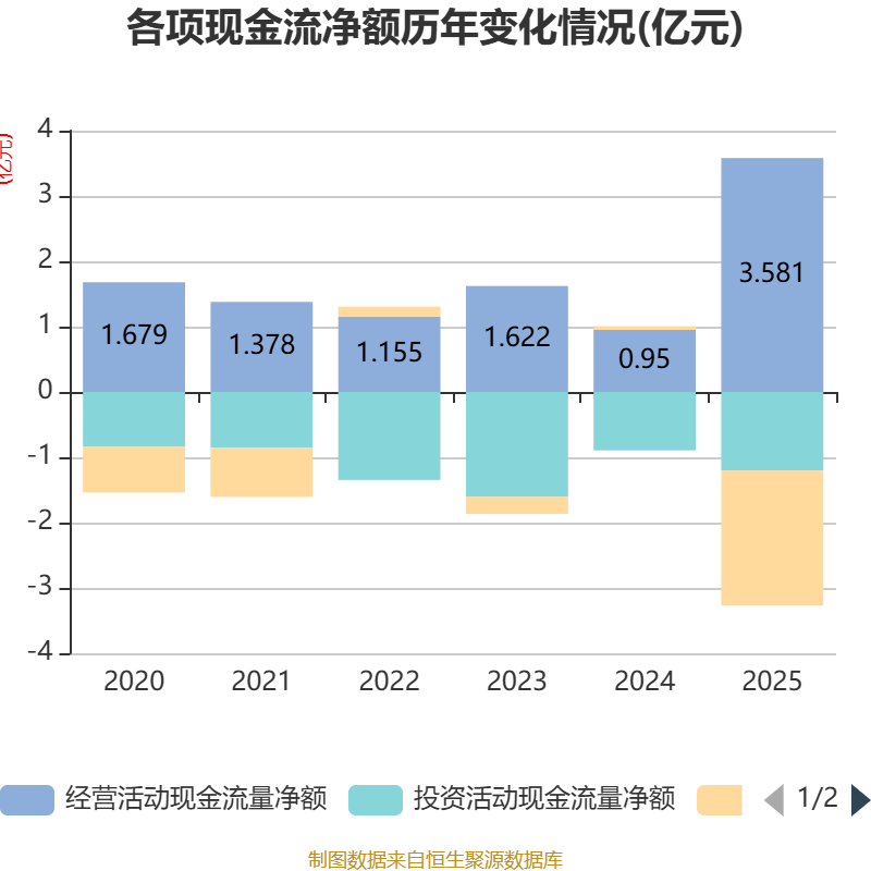 截至2025年,公司经营活动现金流净额为3.58亿元,同比增长276.85%;筹资活动现金流净额-2.07亿元,同比减少2.12亿元;投资活动现金流净额-1.2亿元,上年同期为-8950.25万元。