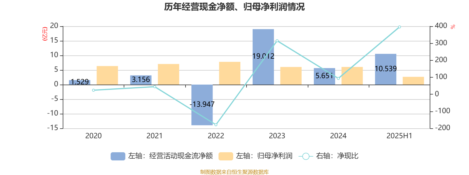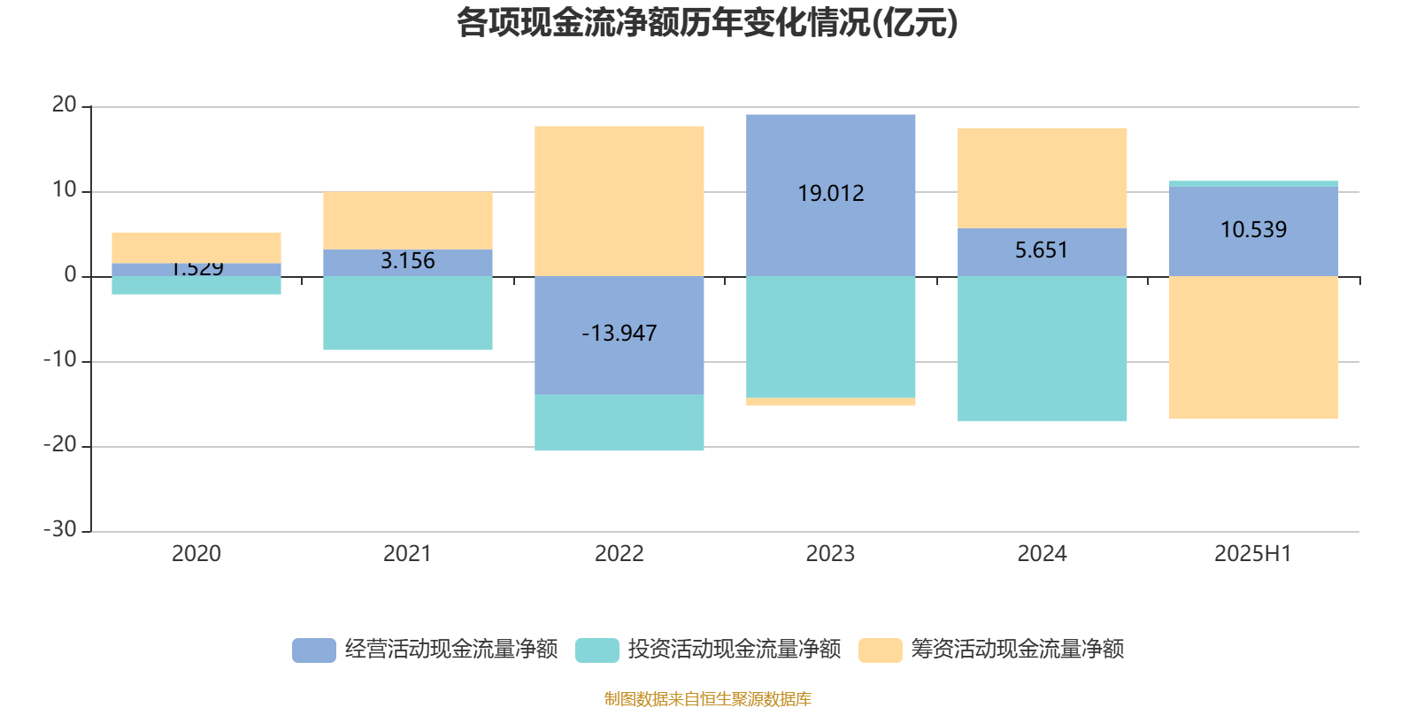 2025年,公司经营活动现金流净额为10.54亿元,同比增长67.42%;筹资活动现金流净额-16.78亿元,同比减少24.31亿元;投资活动现金流净额6822.9万元,上年同期为-13.23亿元。
