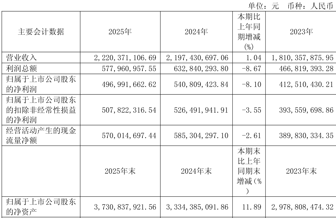 中证智能财讯确成股份(605183)3月28日披露2025年年度报告。2025年,公司实现营业总收入22.2亿元,同比增长1.04%;归母净利润4.97亿元,同比下降8.10%;扣非净利润5.08亿元,同比下降3.55%;经营活动产生的现金流量净额为5.7亿元,同比下降2.61%;报告期内,确成股份基本每股收益为1.21元,加权平均净资产收益率为14.07%。公司2025年度分配预案为:拟向全体股东每10股派现4元(含税)。