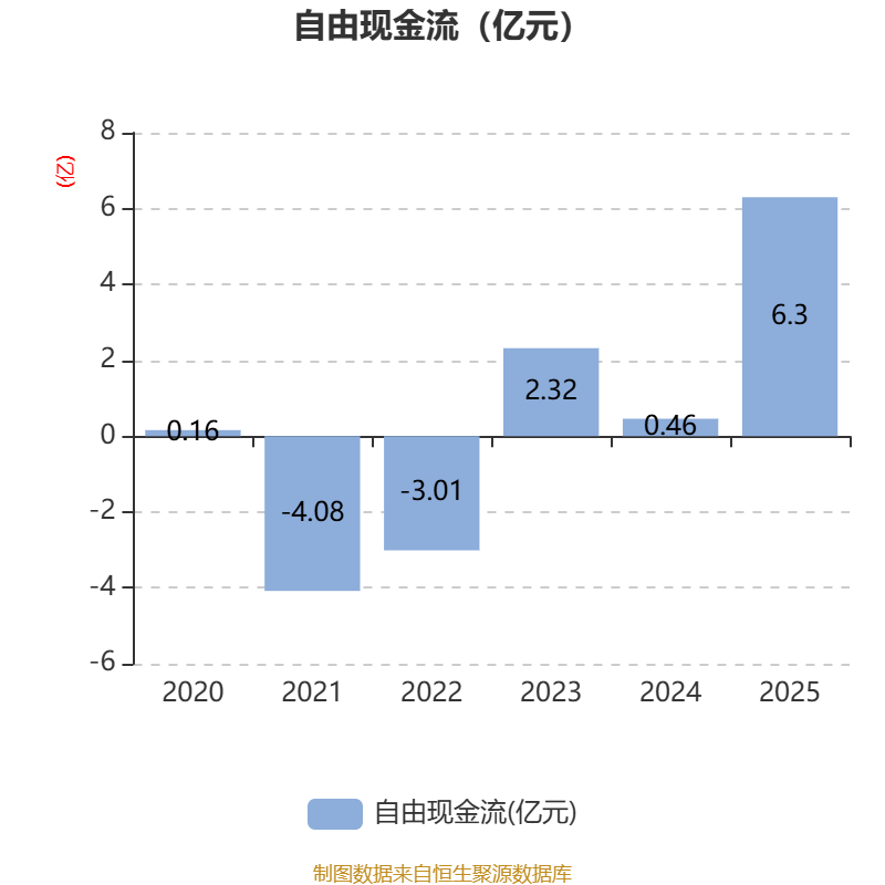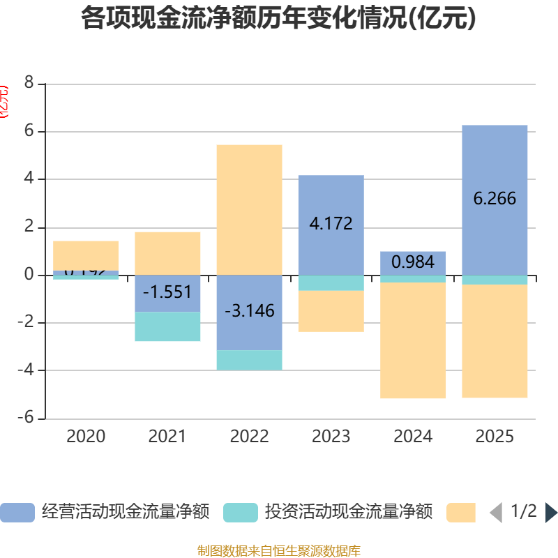 截至2025年,公司经营活动现金流净额为6.27亿元,同比增长536.49%;筹资活动现金流净额-4.73亿元,同比增加1110.49万元;投资活动现金流净额-3991.06万元,上年同期为-3139.94万元。