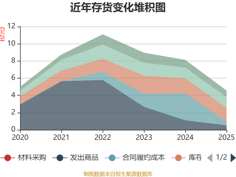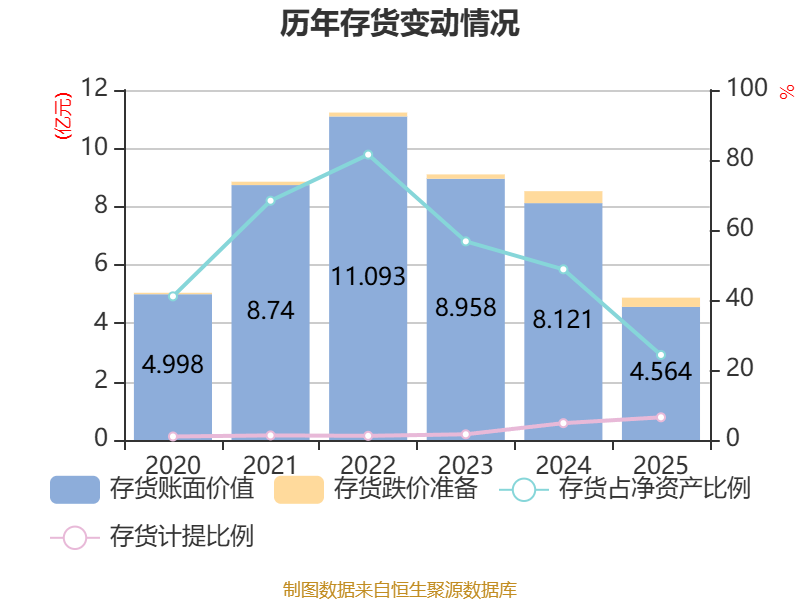 从存货变动来看,截至2025年末,公司存货账面价值为4.56亿元,占净资产的24.31%,较上年末减少3.56亿元。其中,存货跌价准备为3163.21万元,计提比例为6.48%。