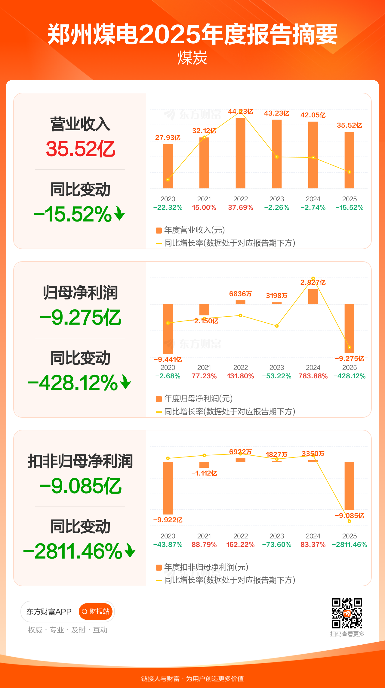 郑州煤电3月28日发布2025年年报显示,公司全年实现营业收入35.52亿元,同比下滑15.52%;归母净利润-9.27亿元;扣非归母净利润-9.08亿元。