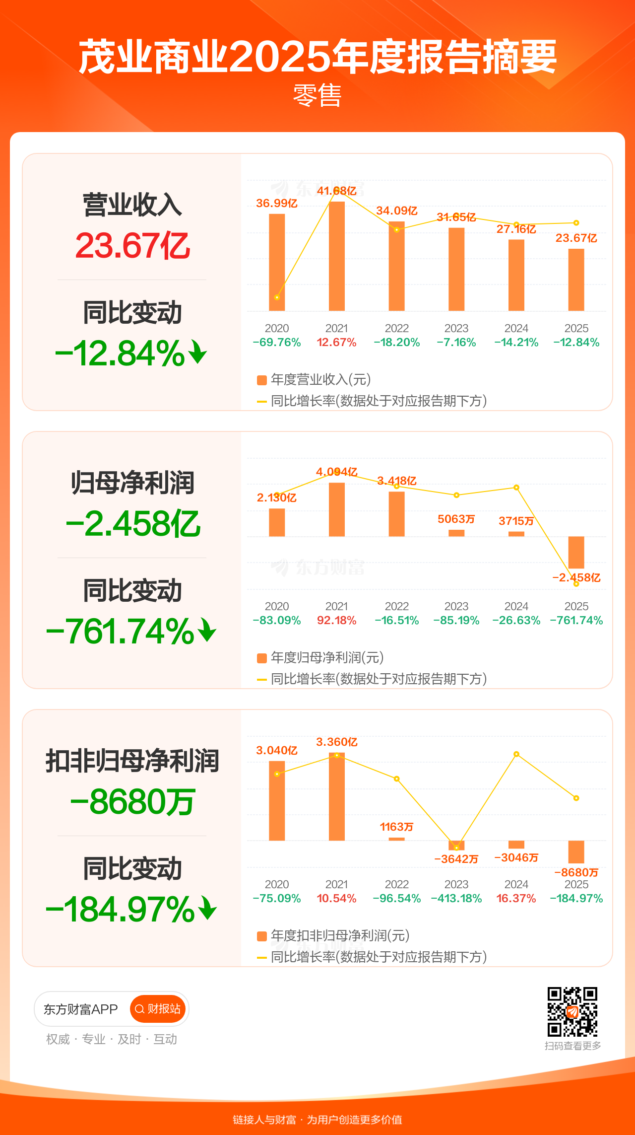 茂业商业3月28日发布2025年年报显示,公司全年实现营业收入23.67亿元,同比下滑12.84%;归母净利润-2.46亿元;扣非归母净利润-8679.52万元。